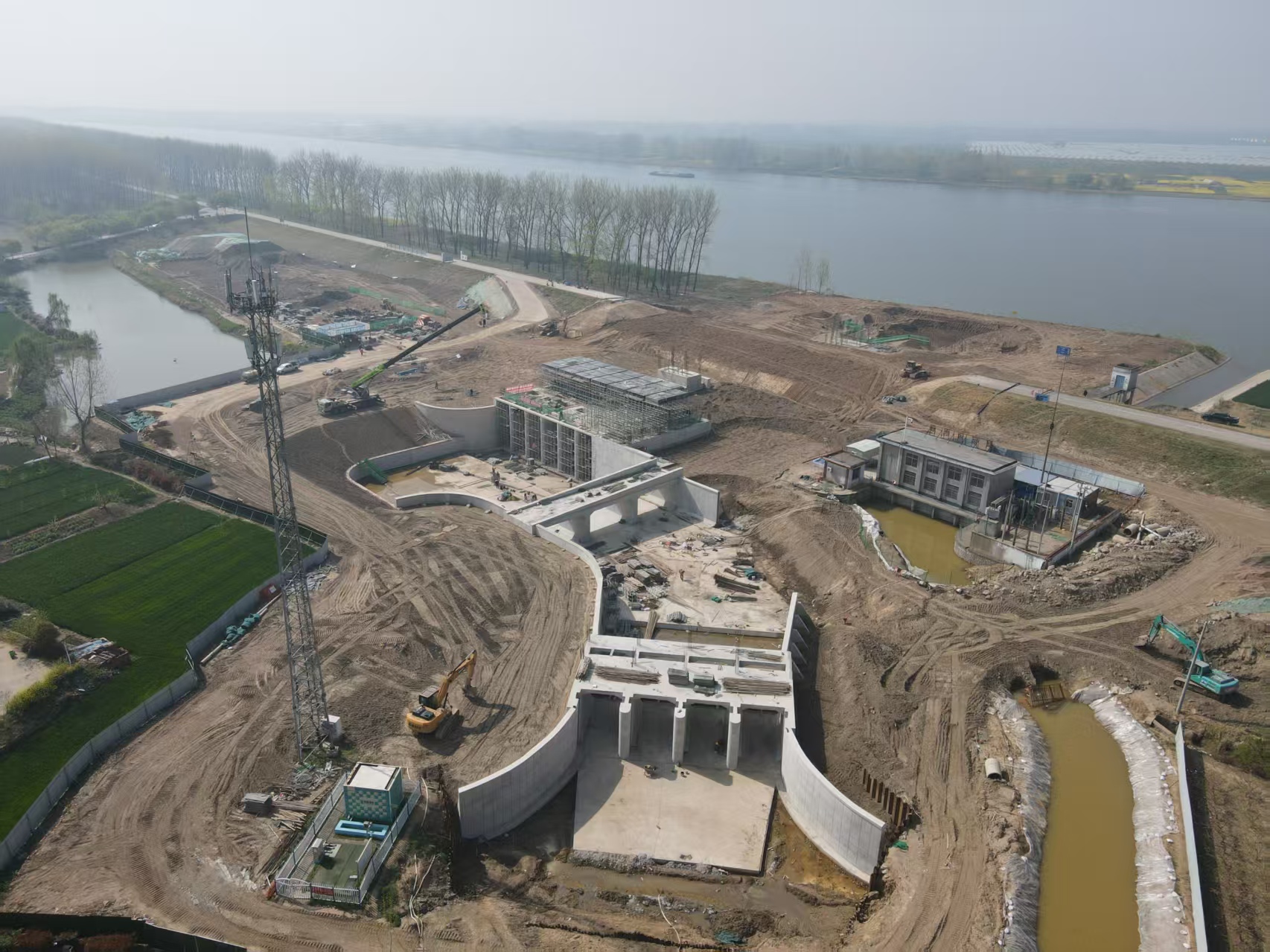 三冲二站是项目泵站工程重要组成部分,位于淮北大堤五河县境内原三冲东涵处,在原址基础上进行扩建。建设内容包括进出水渠、出口防洪闸、抽灌涵及其他附属工程等,设计功能为抽排、自排及抽灌,抽排流量18.95m3/s,自排流量54.23m3/s,共设6台机组,总装机1890kW,为中型泵站。目前,三冲二站泵室流道层、控制段高程19.5米以下、穿堤涵1#-7#洞身及出口翼墙等部位已完成混凝土浇筑,正全力推进泵室电机层钢筋绑扎、模板制安以及堤防土方回填作业。