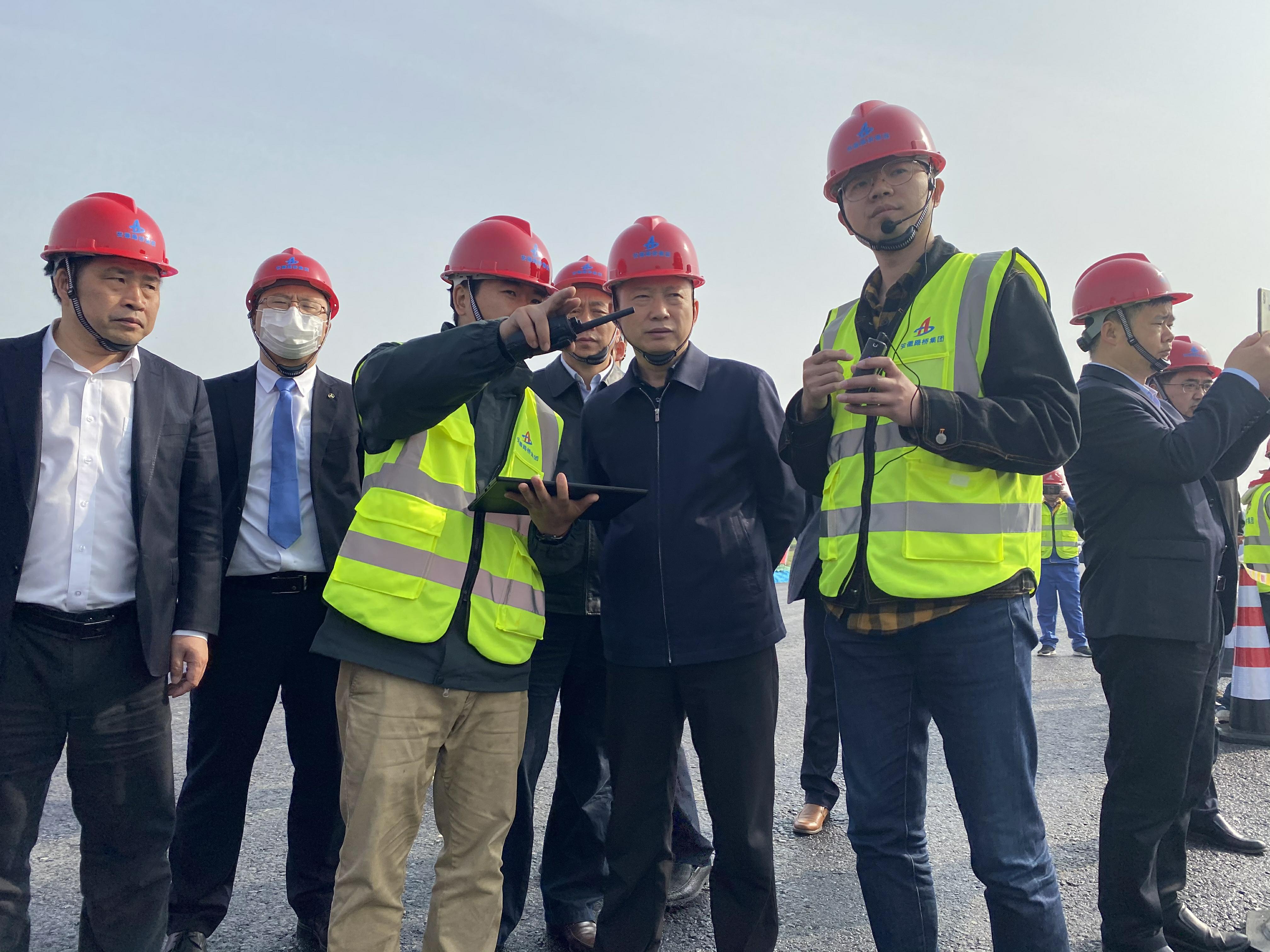 在G347安九二期PPP项目路面施工现场,赵时运饶有兴致地观摩智能无人驾驶沥青摊铺试验段施工,并与技术人员就车辆定位、无线通信、自动控制和可视化技术进行深入交流。在杨湾河特大桥施工现场,赵时运详细了解了项目部依托“BIM+物联网”技术的智慧工地建设情况,观看了物料集成系统演示。